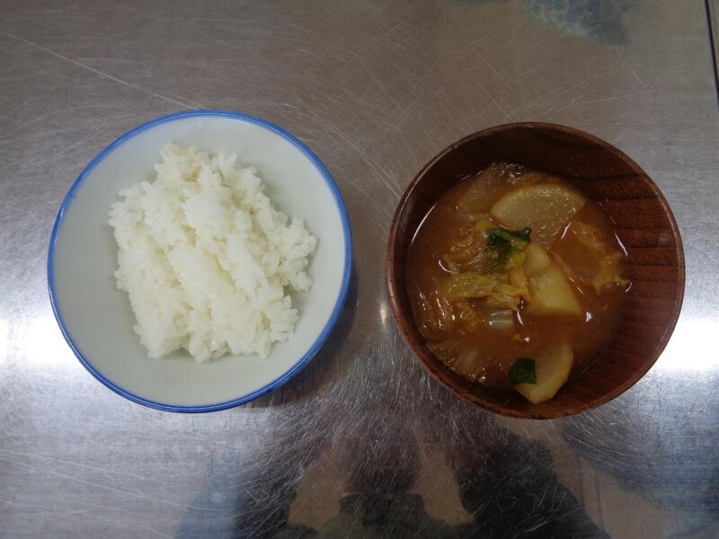 2月26日、授業の様子を見て回っていると家庭科室で5年生が調理実習をしていました。ちょうどできあがったところでした。自分たちで炊いたご飯、そして具だくさんの味噌汁(白菜、大根、小松菜、ネギ)を配膳している様子を見ることができました。
