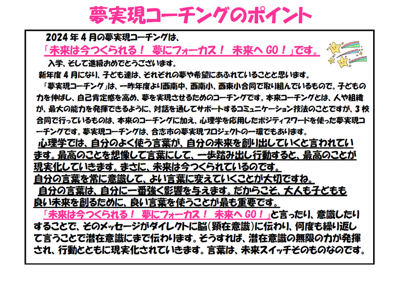 西南小の子どもたちが、ポジティヴな気持ちによって夢を実現できますように!