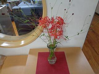 9月24日、正面玄関のに彼岸花が生けてあります。また、朝夕はめっきり涼しくなり、季節の移ろいを感じます。