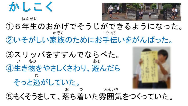 また、こんな情報もありました。3年生児童2人とその兄弟の3人が校外でゴミ拾いをしてくれています。コンビニまで行く道すがら、ゴミを拾ってくれていたそうです。誰もができることではありません。彼らも、とても尊い。ゴミを拾う小学生の姿は、実際ゴミを捨てている人にはどう映るのでしょうか。