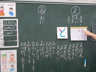 4時間目、1年生は学習したひらがなを使って、短い文を書く練習をしていました。例えば、「〇〇が△△する」という文を作るのですが、「ねこ が なく」「くまが・・・・」など、みんな熱心に考え、学習していました。