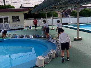 様子を見ているとプール掃除で使ったホウキやバケツ、タワシ等々を片付けているところでした。始業前から、みんなテキパキ行動していました。