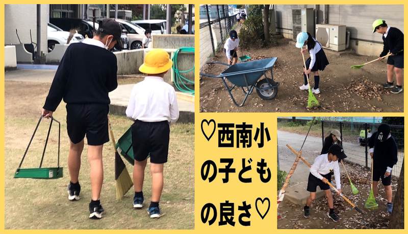 小さな身体でいっしょうけんめい熊手やホウキを使って落ち葉を集める様子や、上級生が教えながらいっしょに作業する様子に、教頭は心を打ち抜かれました。