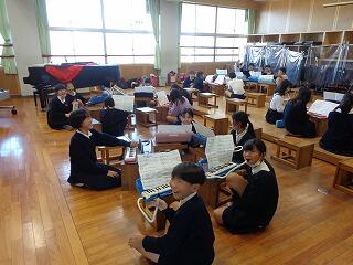 次に音楽クラブです。全員が鍵盤ハーモニカの練習をしていました。どんな曲を練習しているのかなと見ていると、楽譜には「『ダンシングヒーロー』荻野目洋子」とありました。おじさんの心をくすぐる選曲です。