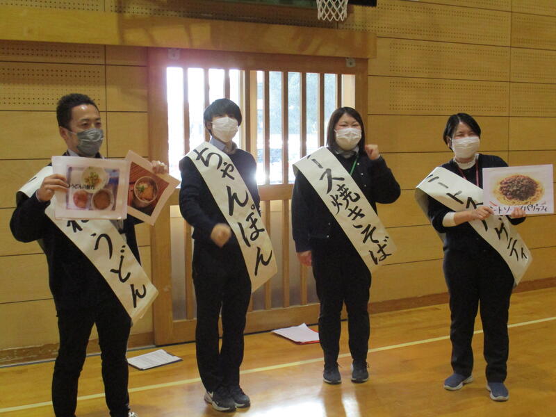 次は、「イケてる麵's総選挙」です。給食のメニューにある「ちゃんぽん」「やきそば」「きつねうどん」「ミートソーススパゲッティ」の4種類の麺を立候補者とし、6年担任がそれぞれについて立ち会い演説をします。