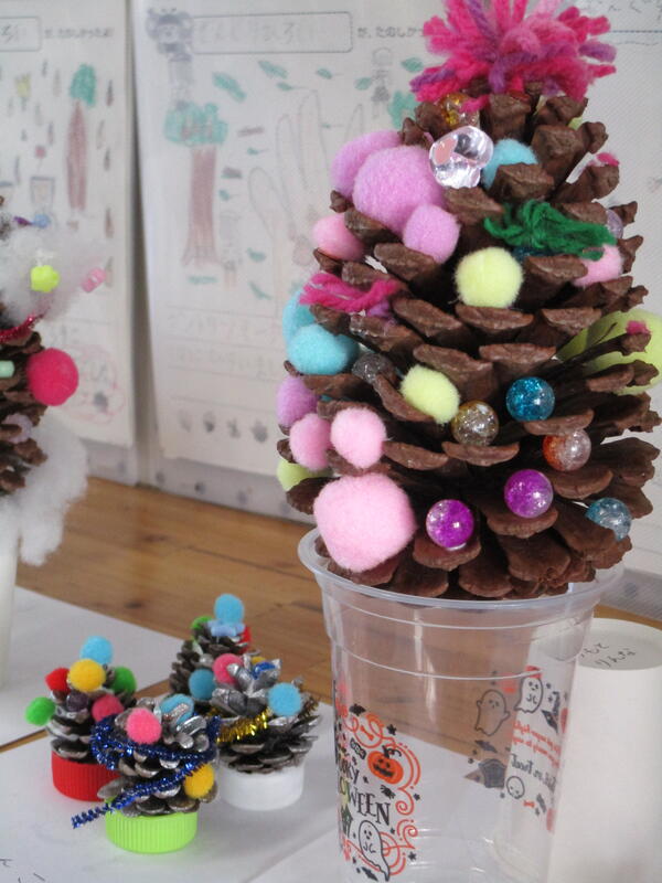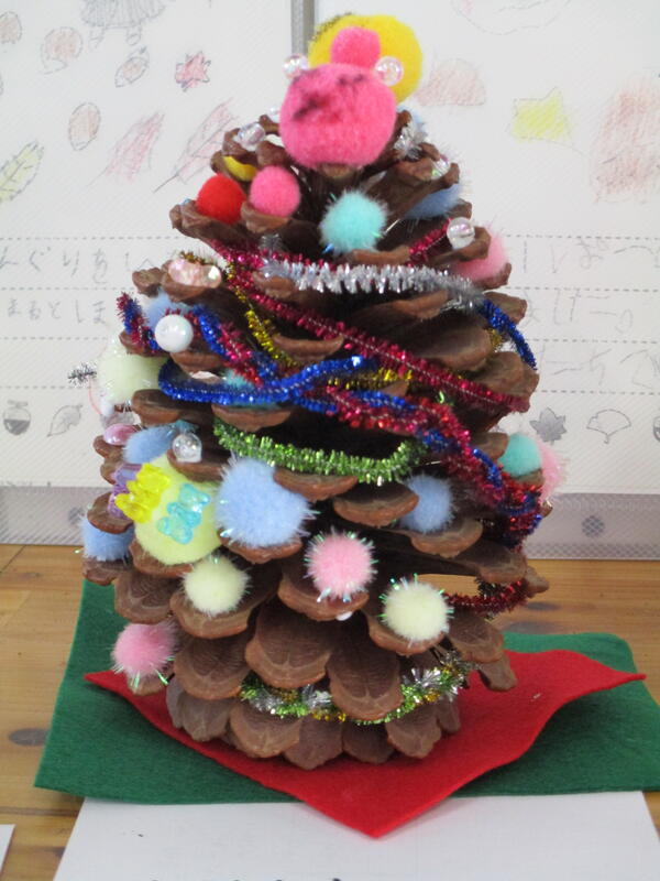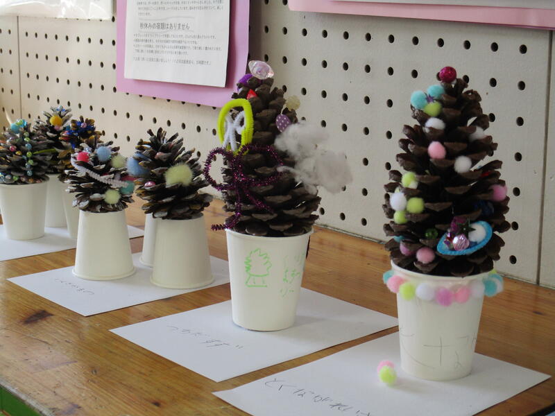 1年生の教室後方に・・・クリスマスツリーの飾りが飾ってありました。