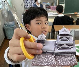 次に行ったのはペーパクラフトクラブです。みんなひたすら切った貼ったしています。そこでズズッと見事な熊本城を差し出す少年↗を思わずパチリ。