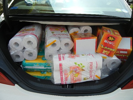 同じ菊池郡内の県立菊池高校生が三人。自分たちにできることをしようと、今回、被害が少なかった地元菊池市内の店舗を回り物資調達をして、おばさんに頼んで車で運んでもらったとのこと。トランクにはトイレットペーパーの他、紙おむつやカイロがさらに積まれていました。