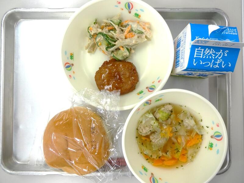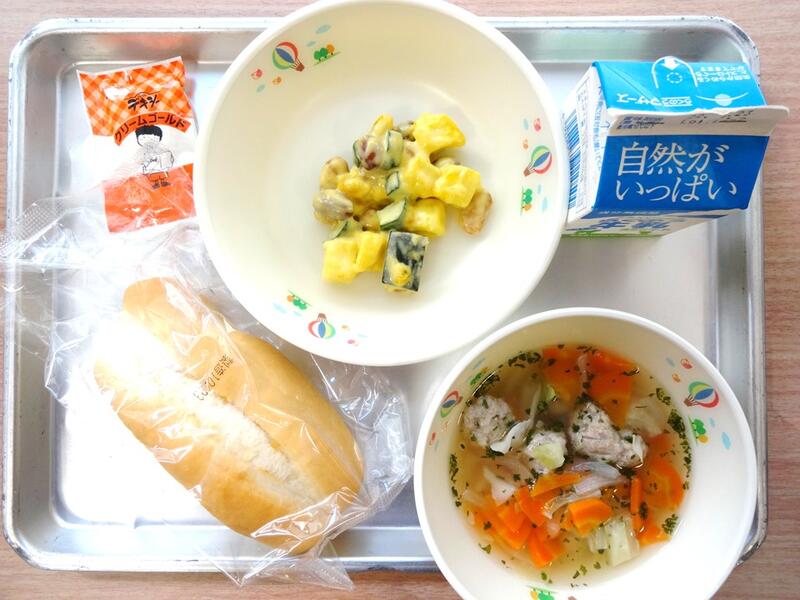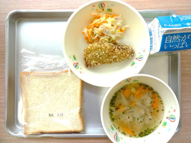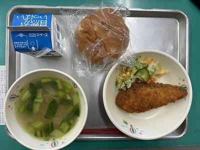 サケのチーズフライは「ザクッ」、スイートコーンサラダは「ポリポリ」、そして、オニオンスープは「ポリホク」と、歯ごたえの良さが心地よい今日の給食でした。パインパンは歯ごたえ的にはさすがに「モグモグ」と表現しますが、実際は無音です。(校長)