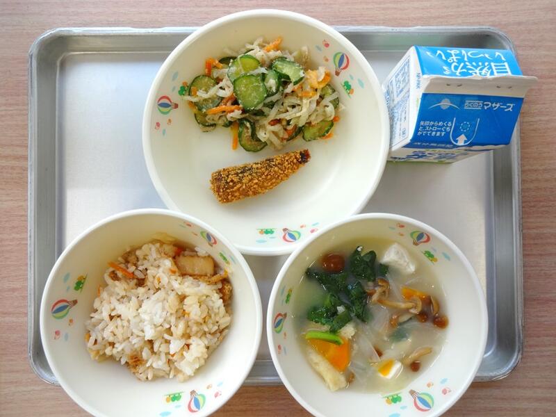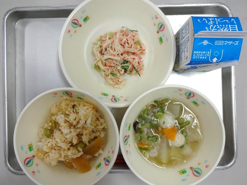 今日は、ふるさとくまさんデーです。上益城をテーマに献立を考えています。上益城の郷土料理である『具飯といちょう葉汁』です。具飯の具は、人参・油揚げ・鶏肉です。いちょう葉汁は、大根と人参をいちょう切りにしています。銀杏に見立てて、大豆の水煮を入れています。秋を感じる汁物となりました。