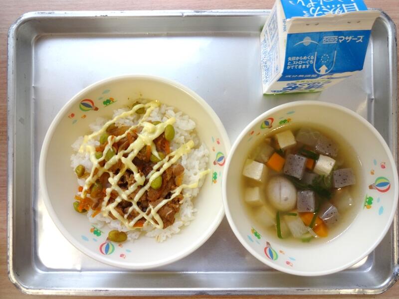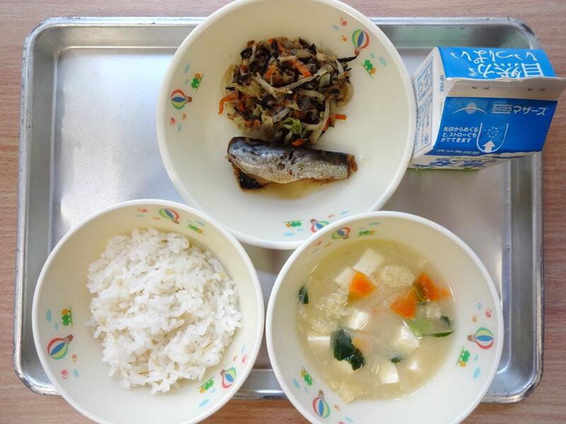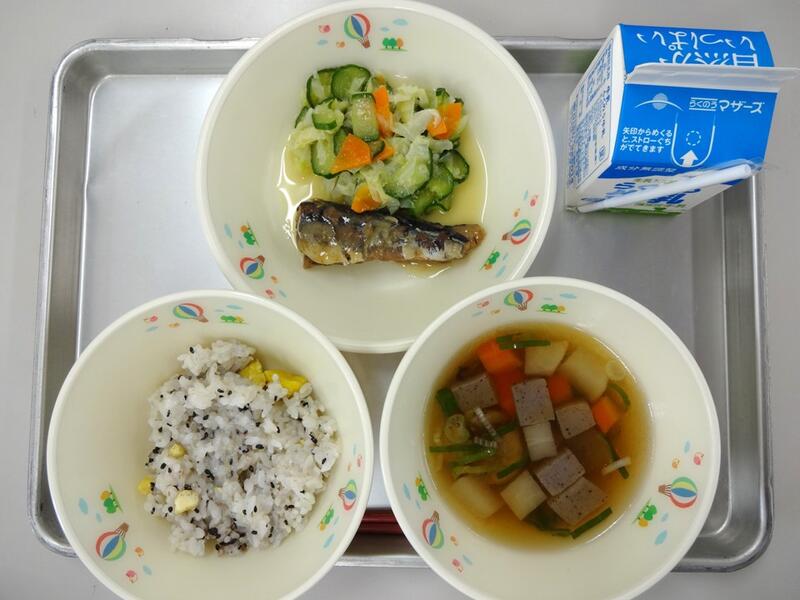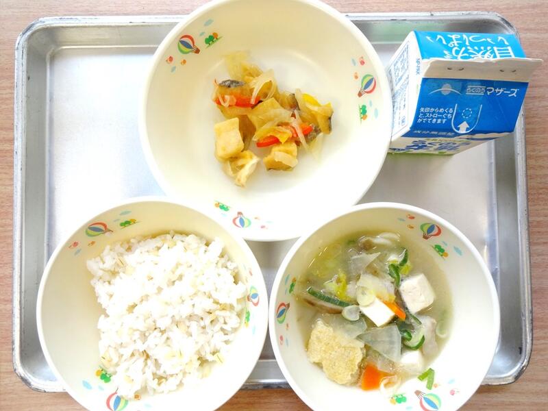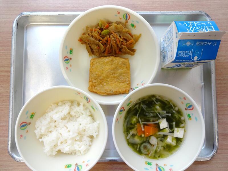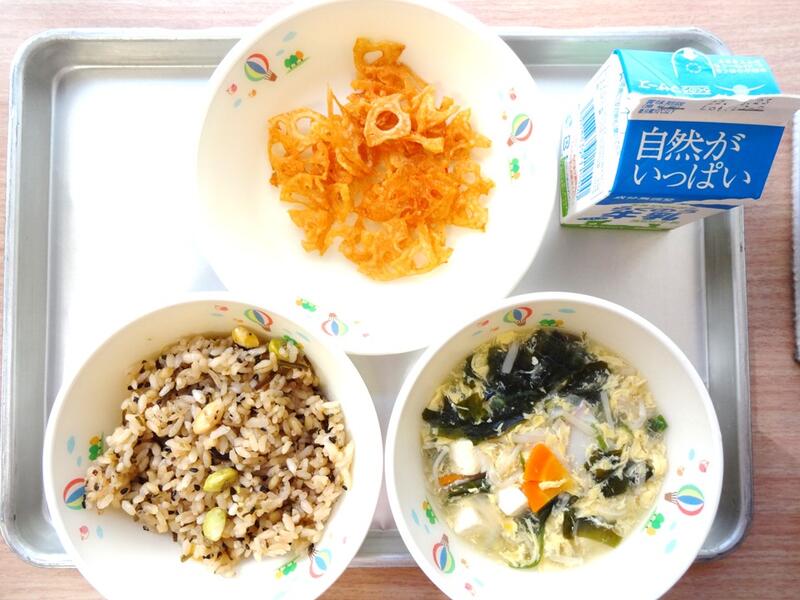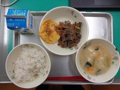 いつも11時50分ぐらいにはいただいています。今日もその時間でした。職員室に来る子どもたちには、毎度見つめられ「お腹がすいた」と言われます。それを横目に今日ももりもり食べました。レンコンの歯ごたえがよく、むぎごはんを頬張り、豆腐のみそ汁をすする「検食」を子どもに見つめられる中で行いました。おいしかったです。「異常なし」です。(校長)