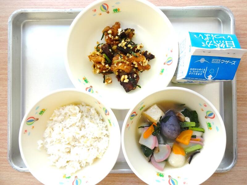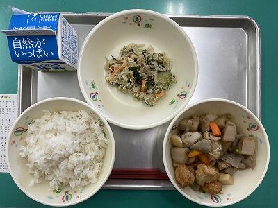 筑前煮は発祥の九州北部の言葉で「がめ煮」とも呼ばれています。「がめ」は「がめくり込む」(寄せ集める)という言葉の略だそうです。旬の食材の使った筑前煮とわかめの酢の物、麦ごはんを口の中にがめくり込んで楽しみました。(校長)