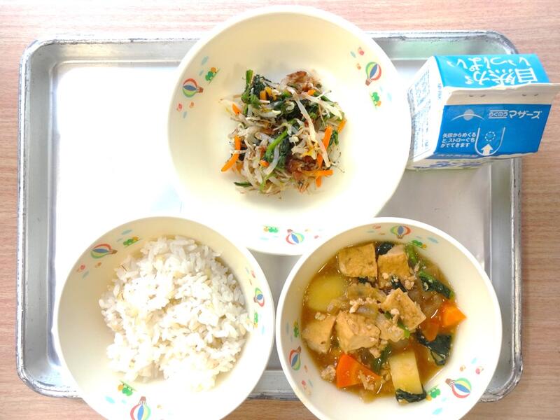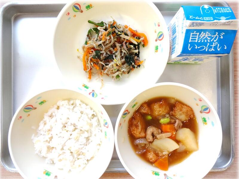 今日の献立は、成長期に必要な栄養素であるカルシウムを盛りだくさんに取り入れた献立です。カルシウムは、骨を丈夫にするだけでなく、心の安定にも繋がる栄養素です。意識して食事をしなければ、不足してしまう栄養素でもあります。今日の厚揚げ・小松菜・ほうれん草・じゃこには、たくさんのカルシウムが含まれています^^