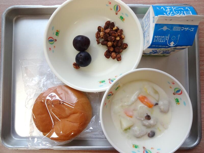 秋が旬のぶどうを給食に取り入れました。甘くて美味しい種なし巨峰でした。子どもたちも大喜びでした★今日の白菜のクリームシチューの味つけは「塩とこしょう」だけです。小麦粉とバターを炒めてホワイトルウを作りました。優しい味つけのクリームシチューとなりました^^