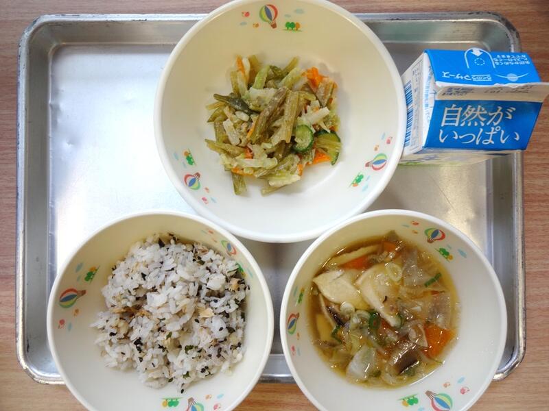今日は「かつお節」のだしを使って、大きいおかずと小さいおかずを作りました。給食では「かつお節」にこだわっています。花かつおではなくて、厚切りかつお節を使っています。厚切りかつお節は、うま味がしっかりでて少量の塩分でも、味が濃く感じます^^体に優しい献立にしています☆