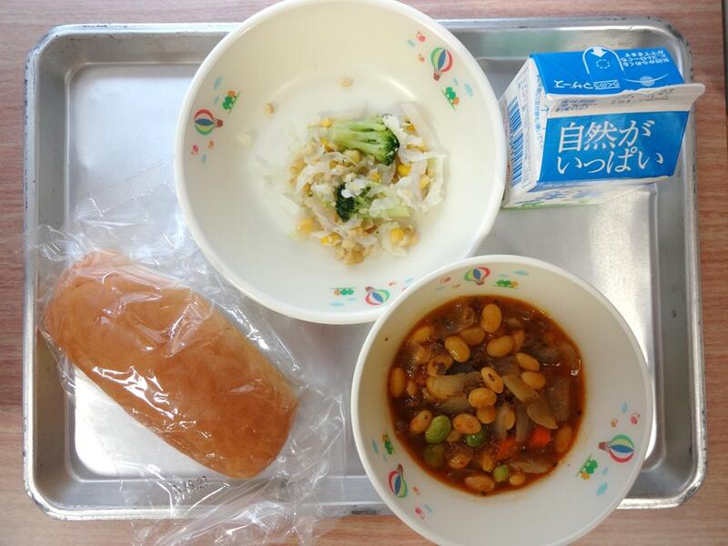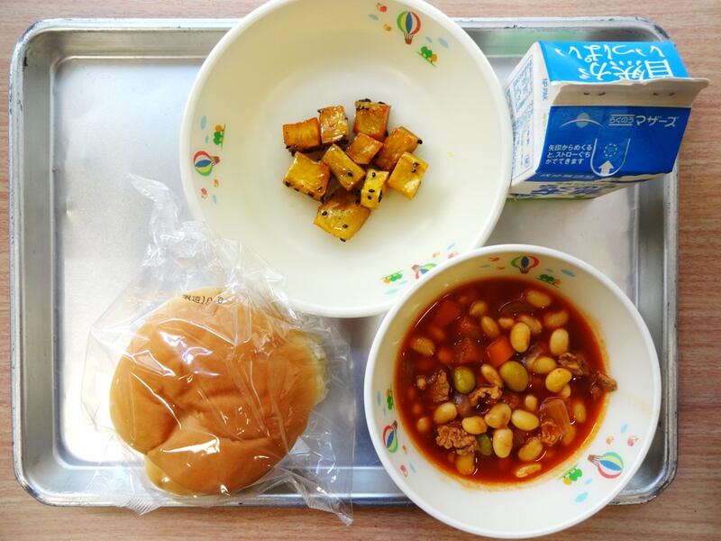 私(50代)が小学生の頃は、毎日丸パンかコッペパンでした。高学年あたりから週1~2回の米飯給食が始まり、お米が好きな私は楽しみにしていました。散々食べた丸パンですが、イタリアンな今日の献立によく合いました。マーシャルビーンズがいらないくらいです。食べましたが。(校長)