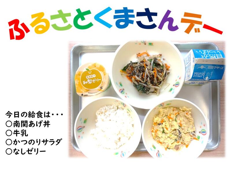 毎月19日は食育の日です。19日前後に、熊本県の各地区の郷土料理や特産品を紹介しています。今日は「荒尾市と南関町」をテーマに献立を考えました。南関町と言えば!!南関あげですね★たくさんの熊本県産の南関あげを使いました。ジューシーなおかずができました。かつのりサラダは、かつお節と熊本県産の海苔を使ってつくります。荒尾市は有明海に面しており、海苔の養殖が有名です!!また、荒尾を言えば梨です。生の果物として梨を提供したかったのですが、1食あたり260円の給食では提供できず・・・梨ゼリーを添えています。熊本の美味しい味を、子どもたちに伝えたいと思っています♪