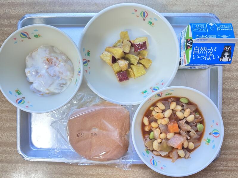 秋休み明けの給食です。旬のさつまいもを取り入れました。西原村産のさつまいもが届きました。甘くて美味しかったです。