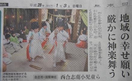年が明けた午前0時から須屋神社で3年生と5年生の児童14人が神楽を披露したことが地元紙(熊本日日新聞)に掲載されました。