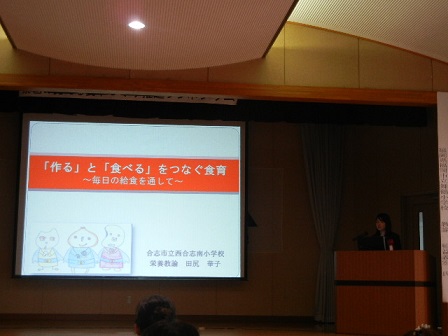 今回は、西南小から田尻栄養教諭が「『作る』と『たべる』をつなぐ食育~毎日の給食を通して~」と題して実践報告をしました。