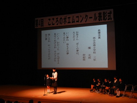 西合志南小学校からも「ポエム」に4名、「作文」に5名(1名が最優秀賞)、「親守歌」に1名(最優秀賞)が入選しました。最優秀賞に輝いた西合志南小の2組がステージ発表しました。