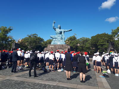 昼食を稲佐山観光ホテルでとり、平和公園で、集合写真を撮った後、平和集会を行いました。