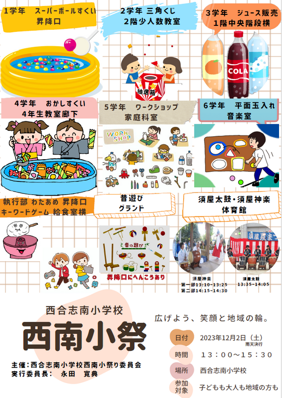 12月2日(土)、いよいよ西南小祭りが開催されました。大勢の子どもたち、保護者・地域の皆さまにお越しいただきありがとうございました。