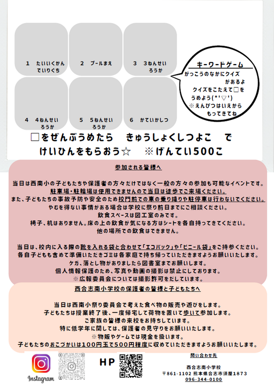 4年ぶりの西南小祭り開催です。学校関係者以外の地域の皆さまのご来校をお待ちしております!