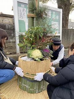 12月23日(土)に、PTA応援委員さんを中心に、PTA有志の皆さまに集まって頂き、門松づくりが行われました。学校からも校長、教頭、PTA事務が参加しました。須屋神社の門松づくりに携わっておられる方を講師にご指導をお願いしていましたが、ご指導はもちろん、材料も粗方揃えて頂いていました。大変感謝申し上げます。