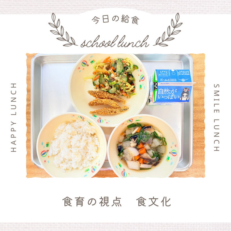 今月のふるさとくまさんデーは「人吉・球磨」をテーマに献立を考えています。人吉・球磨の郷土料理は「つぼん汁」です。鶏肉やかまぼこ、根菜類を小さく切り、野菜のうま味を生かした汁物です。秋祭りに、よく作られるそうです!!