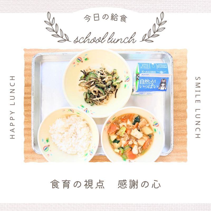 今月の「ふるさとくまさんデー」は、芦北・水俣地域の食をテーマにした献立です。不知火海に面したこの地域は海の幸がとても豊かです。今日は「いわし・わかめ・あおさ」が給食に登場しました。