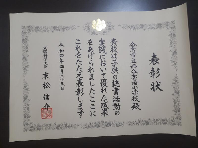 この度、昨年度の取組(「私のおすすめの本紹介」「赤白対抗読書ため入れ」「読み聞かせ(司書、PTA、委員会活動等)」等)で西合志南小学校は、令和4年度の文部科学大臣から表彰を受けました。これまでの本校の読書活動の取組を認めていただいた形となりました。大変ありがたいことです。保護者の方や地域の方にも感謝申し上げます。