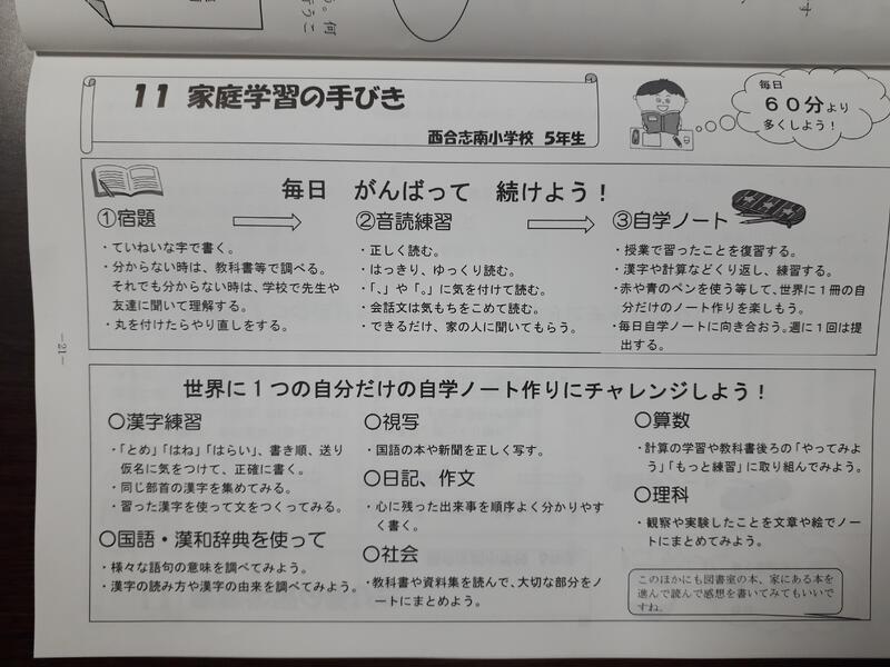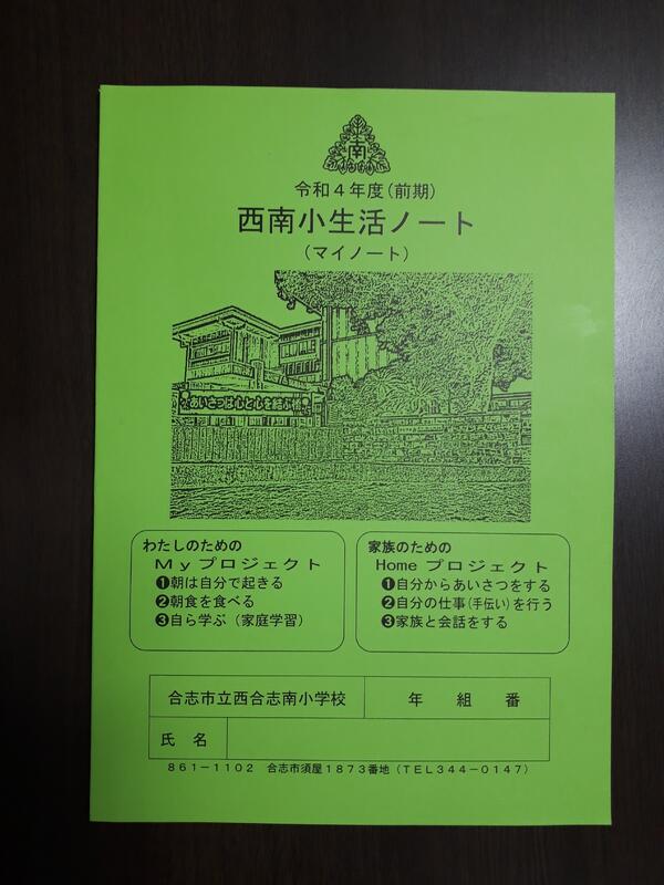 西南小生活ノート(マイノート)の有効活用をお願いします。(5・6年生) 各ご家庭でも「志合わせて夢実現プロジェクト」の「Homeプロジェクト」の実施、西南小生活ノートの確認をお願いします。