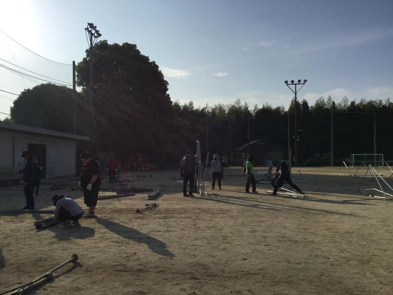 先生たちも頭と体をつかい、12張のテントを張りました。