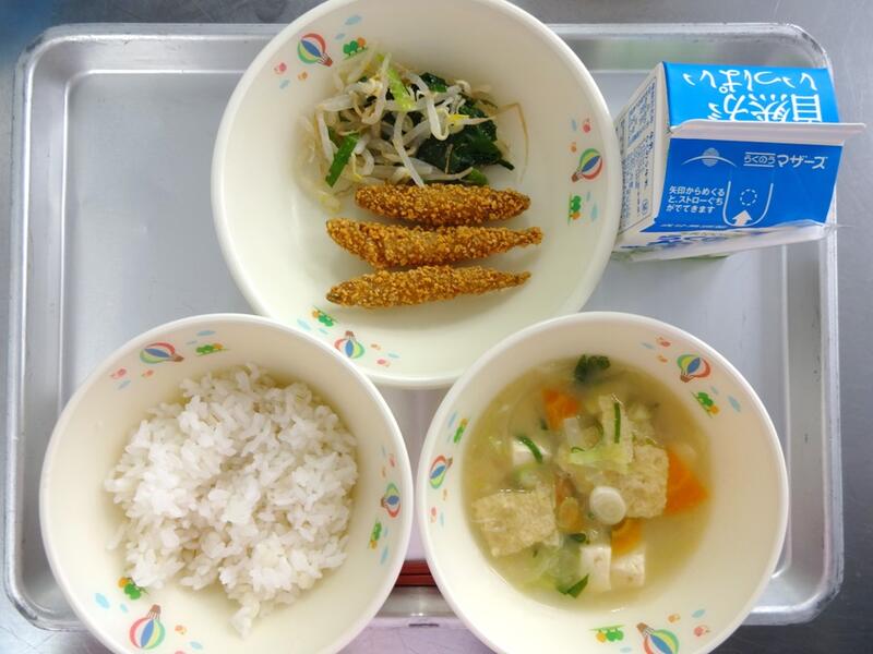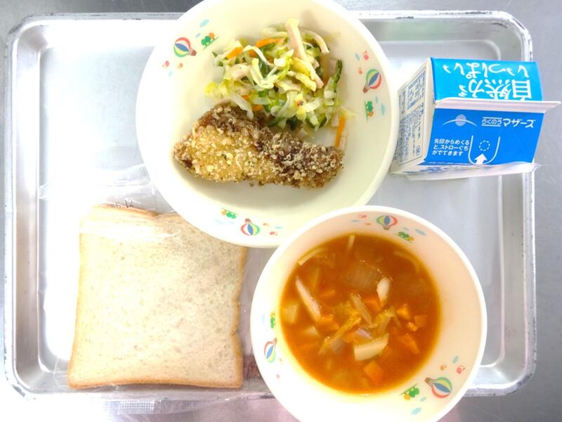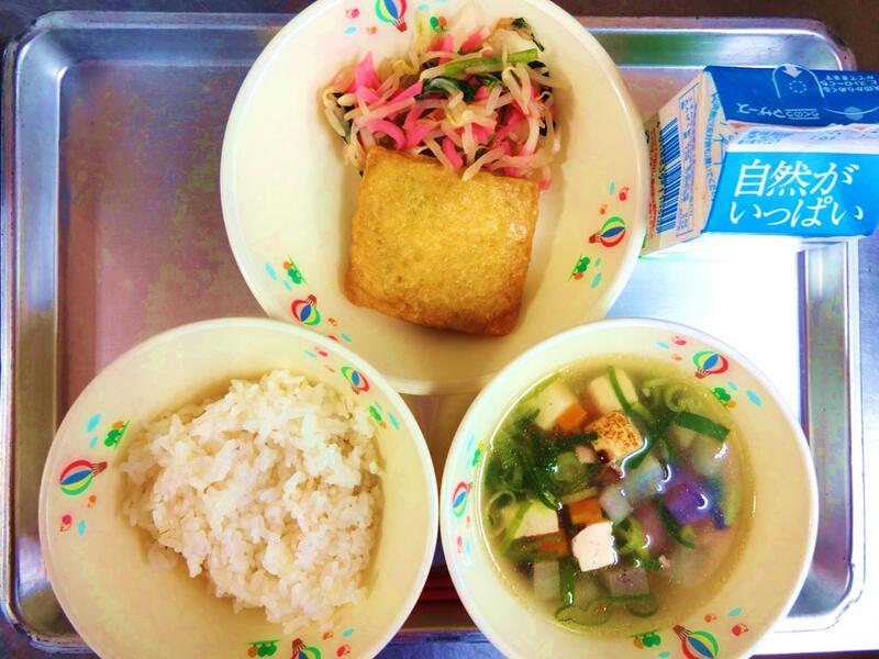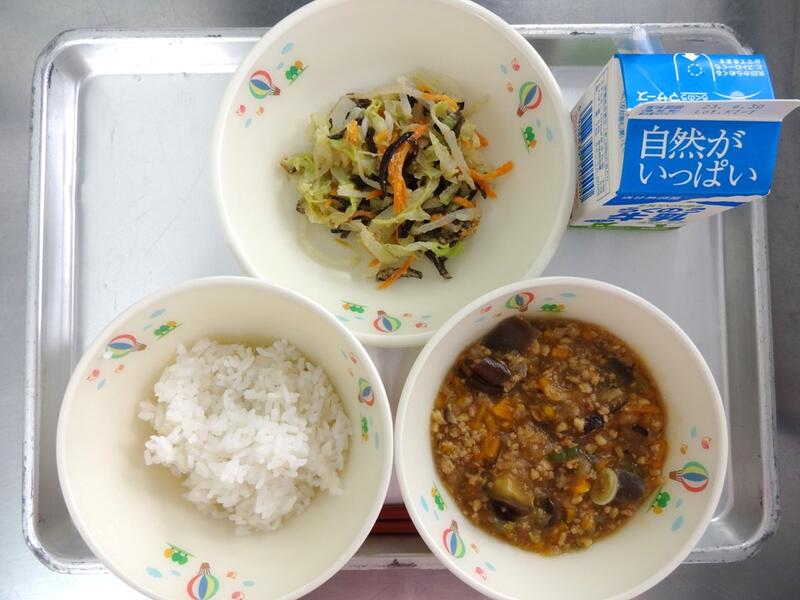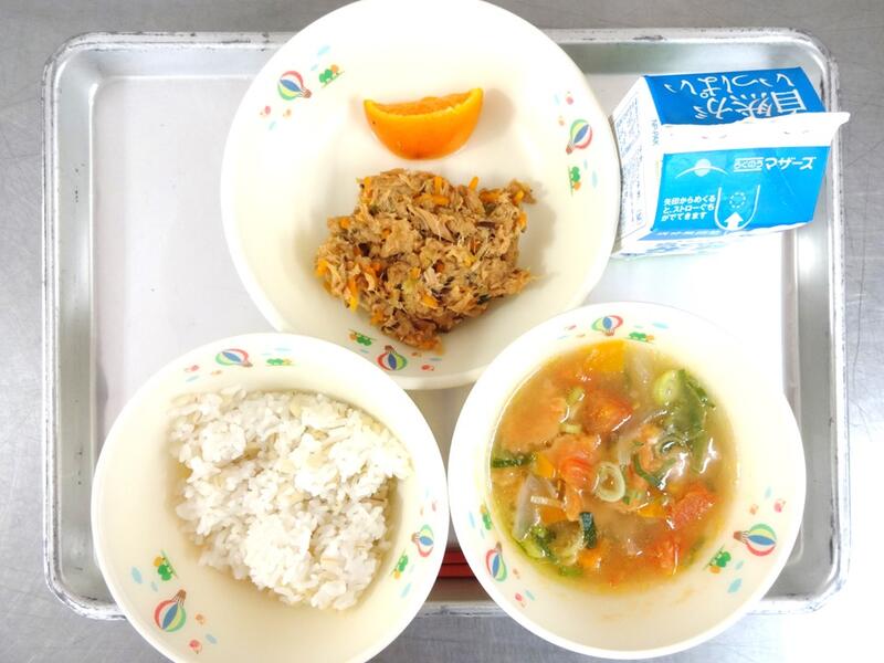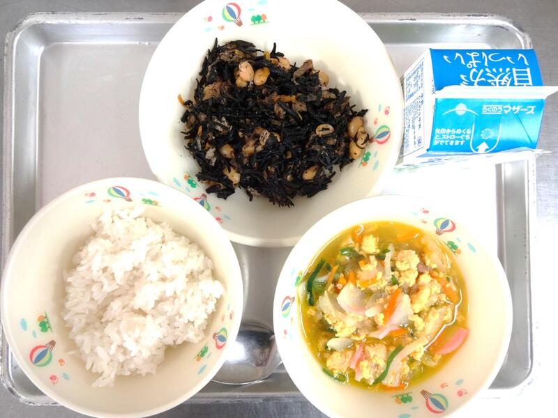 たぬき汁は、煮干しだしを活かして作りました。さつま揚げのうま味もでました。キャベツのひじき和えには、ひじきの佃煮を入れています。ひじきが苦手な子でも、ひじきの佃煮にすることで食べやすくなります。海藻にはミネラルが豊富に含まれています。普段、好んで食べる食材ではないので、給食では意識的に取り入れたいと思っています。
