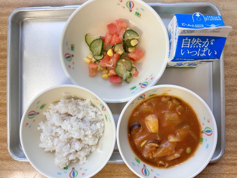 かぼちゃや、なす、トマトなどを使った『夏野菜カレー』を作りました。野菜の色合いから、夏を感じるカレーとなりました。