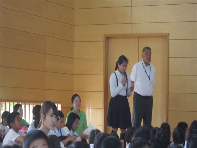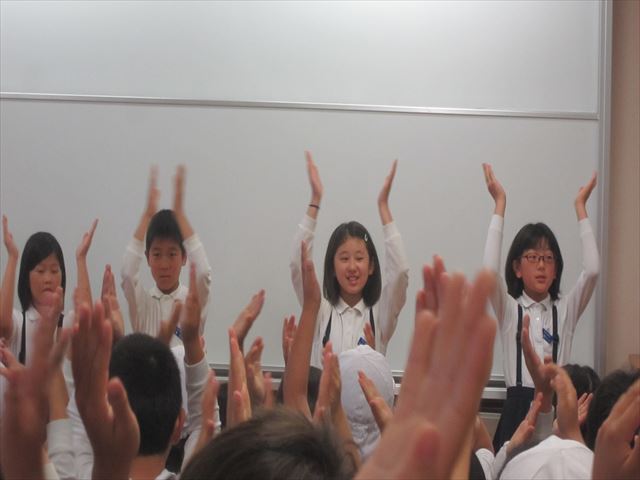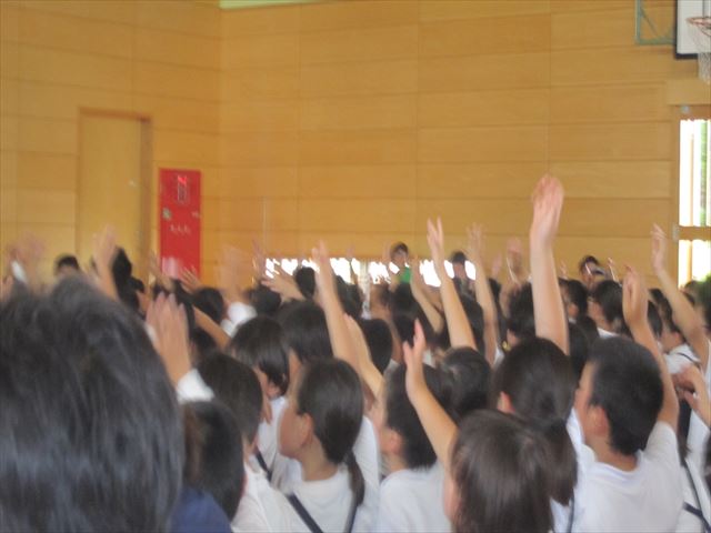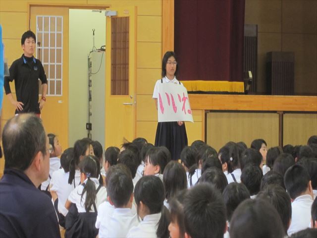 集会委員会が待ち方の上手な学年の前に「いいね」カードを持ち、スムーズな進行を促していました。
