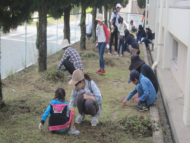 朝早くからたくさんの保護者の皆さんと子どもの皆さんで学校の隅々の草取りや、運動会に向けてのテント張りをしていただきました。