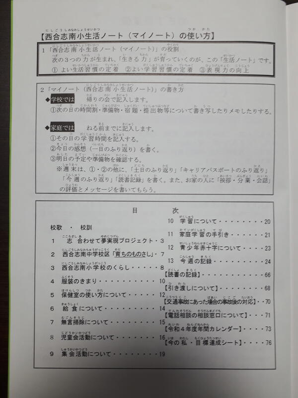 さらに、この西南小生活ノート(マイノート)の前半は、学校生活での活動・利用の流れ等(給食や保健室利用等)や家庭学習の手引きなど、学校生活等で理解しておくべきことが記載されています。この西南小生活ノート(マイノート)1冊で、西南小の学校生活についてのポイントが子どもたち、教職員、保護者の方がわかるように作成しています。年間計画等(予定)も掲載しています。ご活用をお願いいたします。