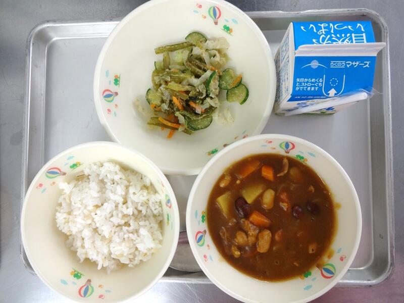 今日は、子どもたちが大好きなカレーです。学校給食では、カレーに使う玉ねぎを「きつね色」になるまで炒めます。玉ねぎを十分に炒めることで、甘みが増します。家庭で玉ねぎを「きつね色」になるまで炒めるのは大変ですよね・・・。学校給食ならではの味わいになります