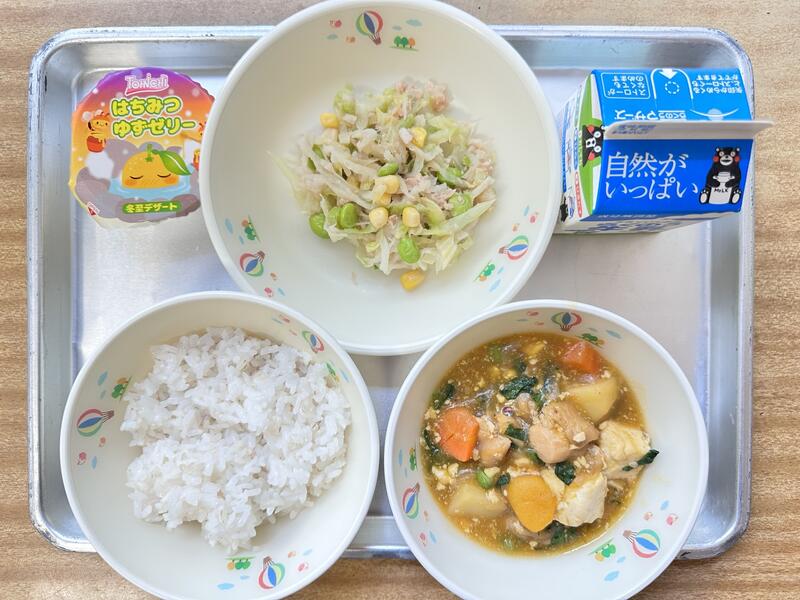 今年の冬至は、2025年12月21日です。冬至にちなんで、かぼちゃ・ゆずを給食に取り入れました。冬至の日に、栄養満点のかぼちゃを食べる風習があります。また、ゆず風呂に入る風習もあります。