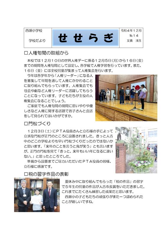 今年度も「せせらぎ」という題で学校だよりを発行していきます。できるだけ学校の様子や保護者の皆様にお願いしたいこと等をお伝えしたいと考えています。紙媒体でも配布していおりますので、ホームページの方はお知り合いの方や地域の方々にもご覧いただければ幸いです。よろしくお願いします。
