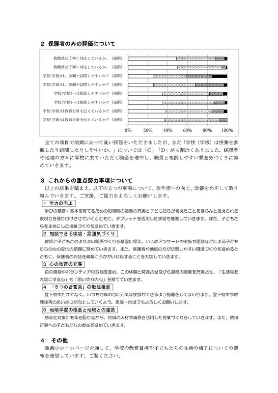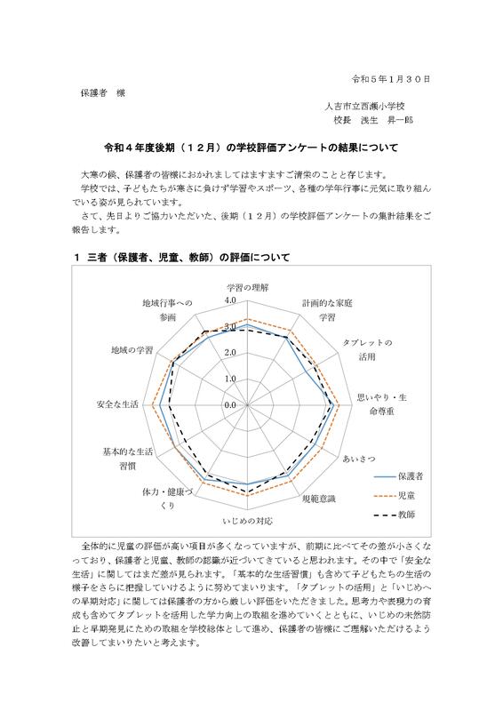 12月にご回答いただいた本年度後期の学校評価について、結果をお知らせいたします。保護者の皆様から頂いた評価と子どもたちからの評価、先生方の自己評価を比較・分析しております。この評価結果を受けて、今後の西瀬小学校の教育活動を見直し、改善策に取り組んで参りたいと考えます。ご確認ください。
