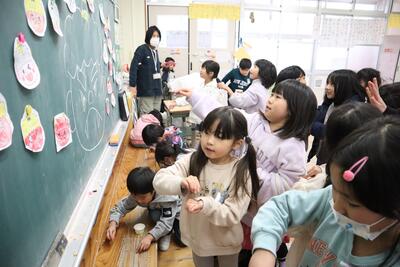 21日に来年度の1年生の体験入学がありました。今の1年生とお手玉やけん玉、メンコなどの昔遊びで交流した後に、教室で算数セットを使っておはじき遊びをしました。1年生は来年入学してくる保育園児のお世話を頑張っていました。ちょっぴりお兄さん、お姉さんになった顔をしていました。