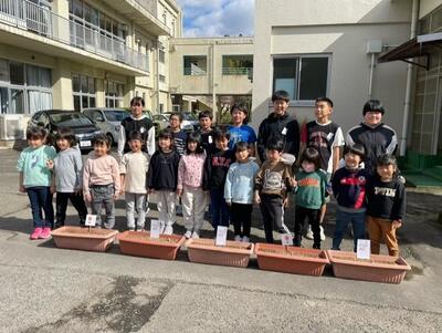2月6日にせんげつ保育園から思いがけないプレゼントがありました。保育園の子どもたちが植えたチューリップのプランターをいただきました。以前、環境ボランティア委員会で育てた苗を植えたプランターをせんげつ保育園さんに贈っていたことのお返しでいただきました。委員会の子どもたちとせんげつ保育園の子どもたちとの素敵な交流ができました。