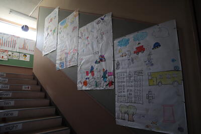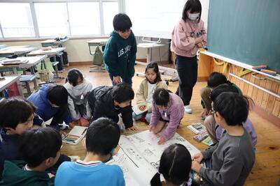 3学期の縦割り活動は、班ごとに「100年後の人吉を描く」ことにチャレンジしてもらっています。22世紀には科学技術がどれくらい発達して、どんな暮らしになっているのかを絵に表しています。時間が短くて完成できなかった班もありましたが、どれも楽しいアイデアの絵ができています。階段のところに掲示していますので、来校された際にご覧ください。