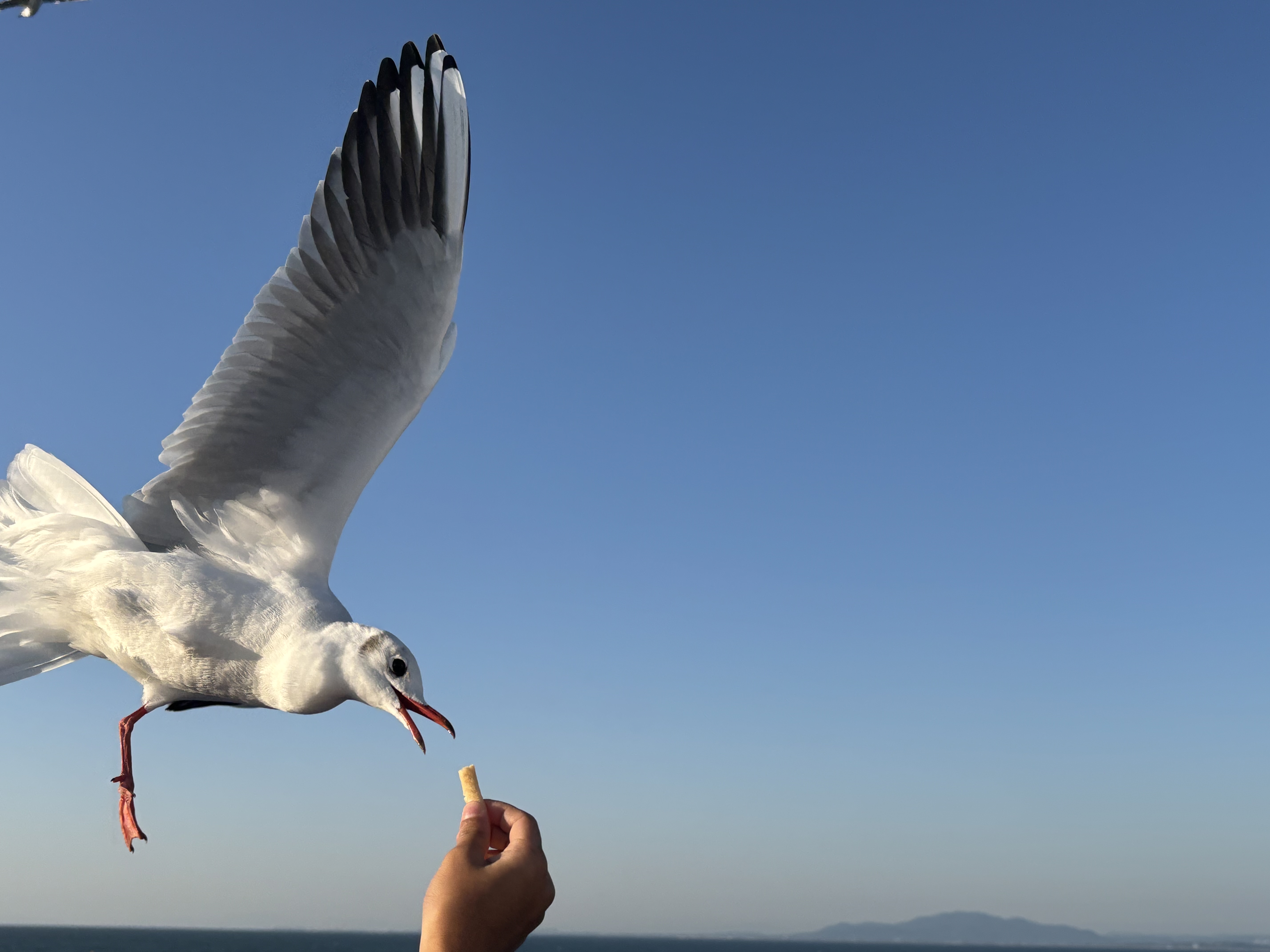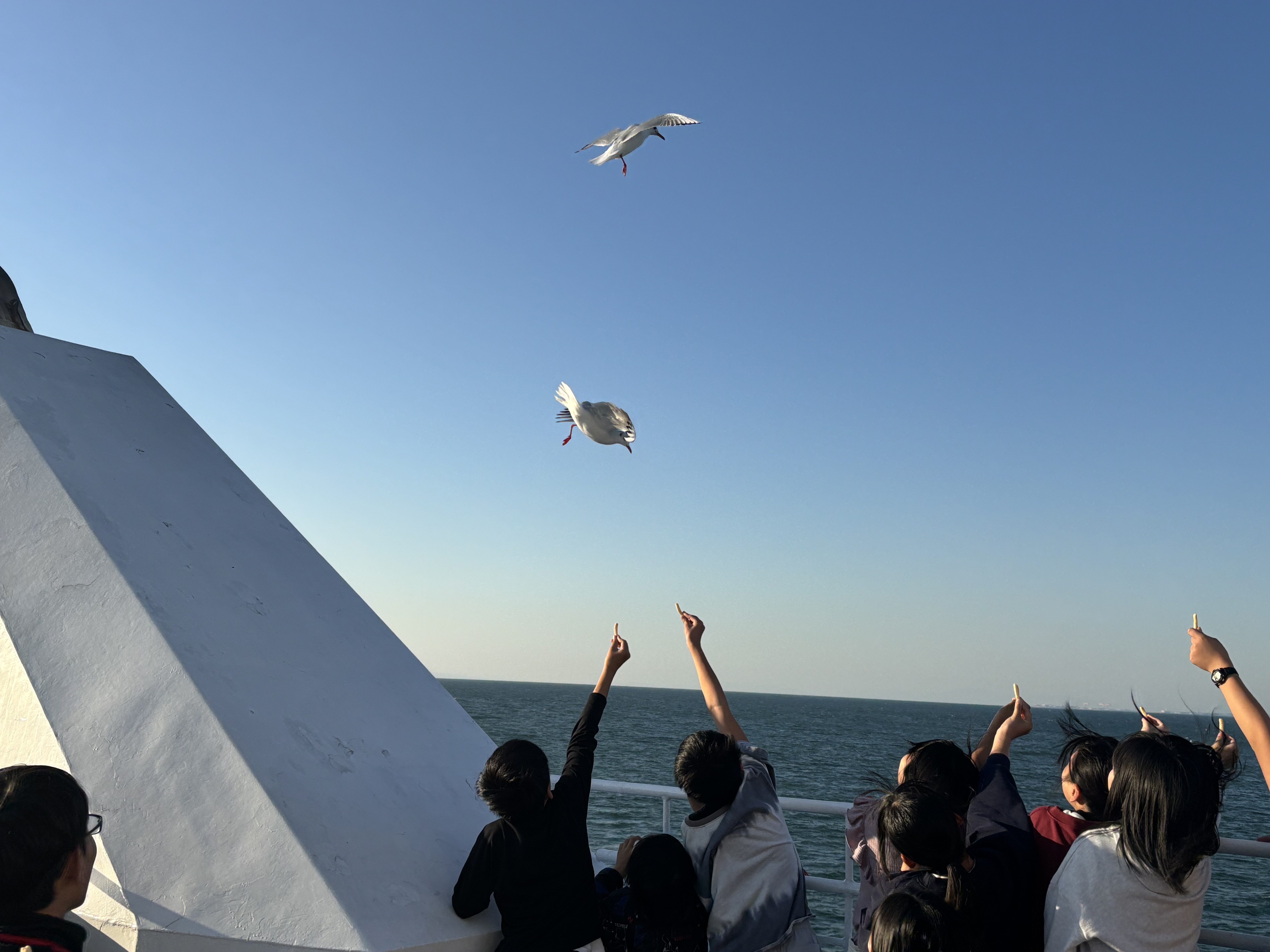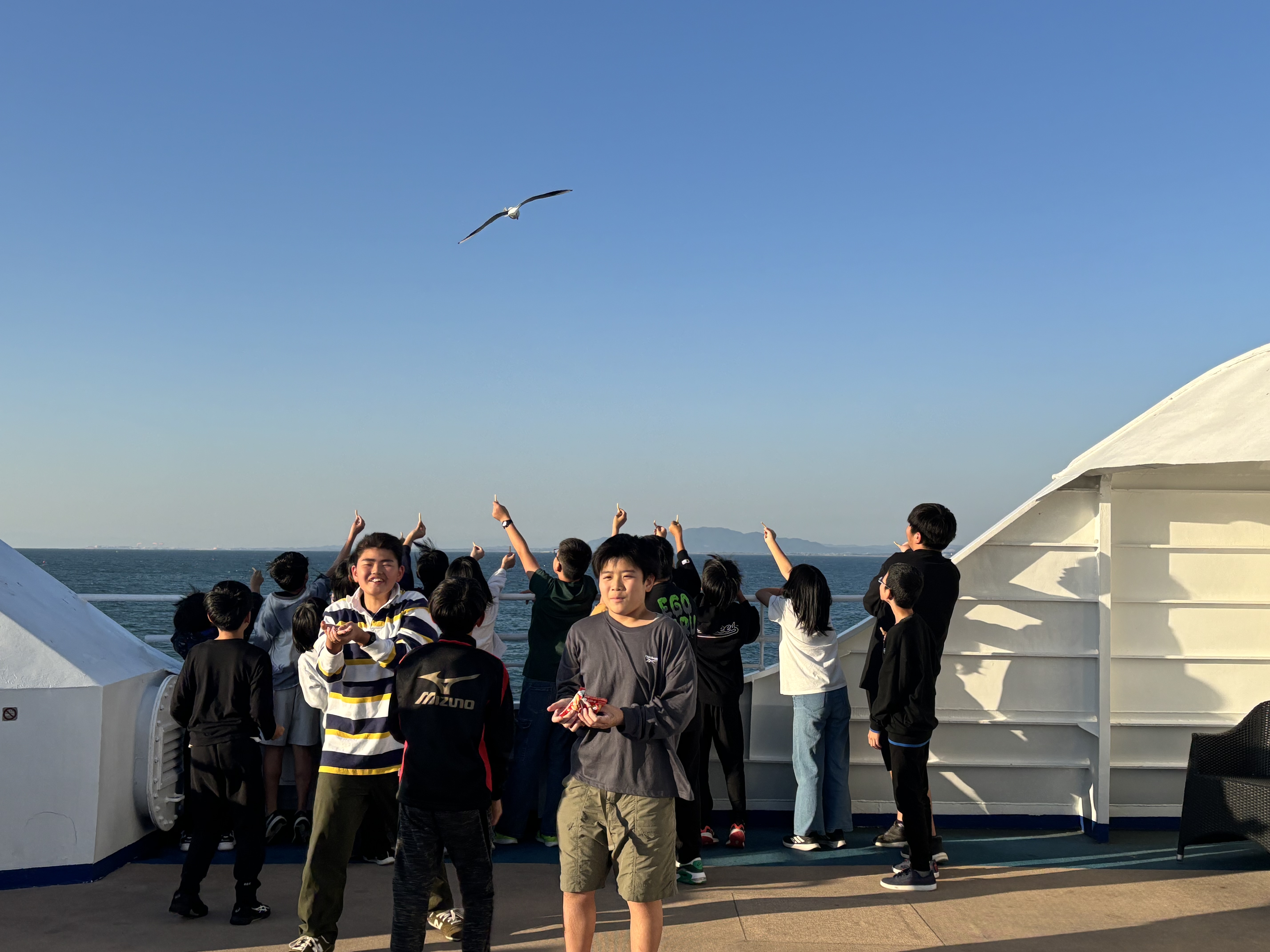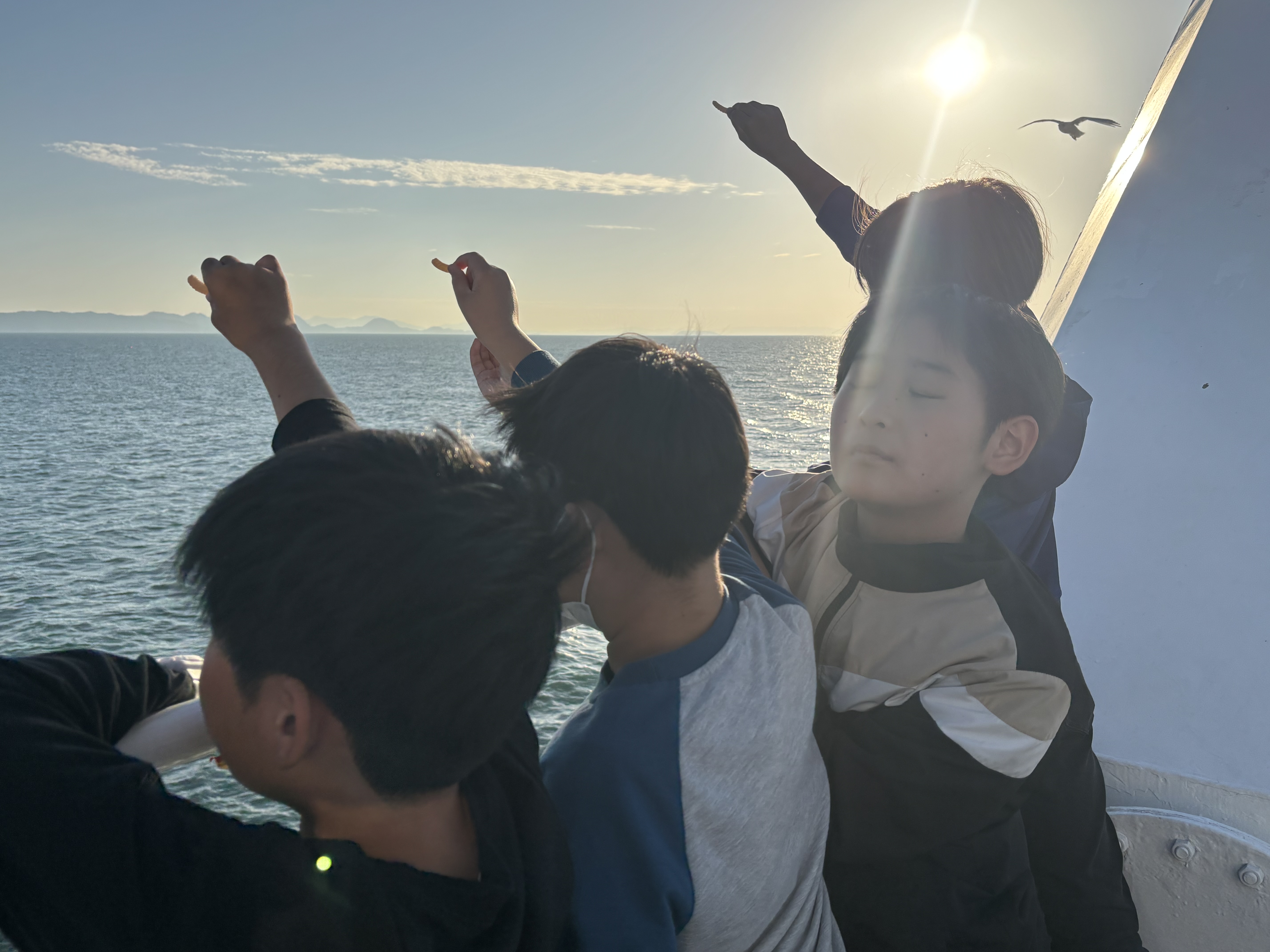 フェリー発乗船の子供達もいました。かもめへエサやり。なかなか近づいて来ないかもめたちでしたが、後からはかもめの襲来を受けるほどで、大喜び?の子供達でした。
