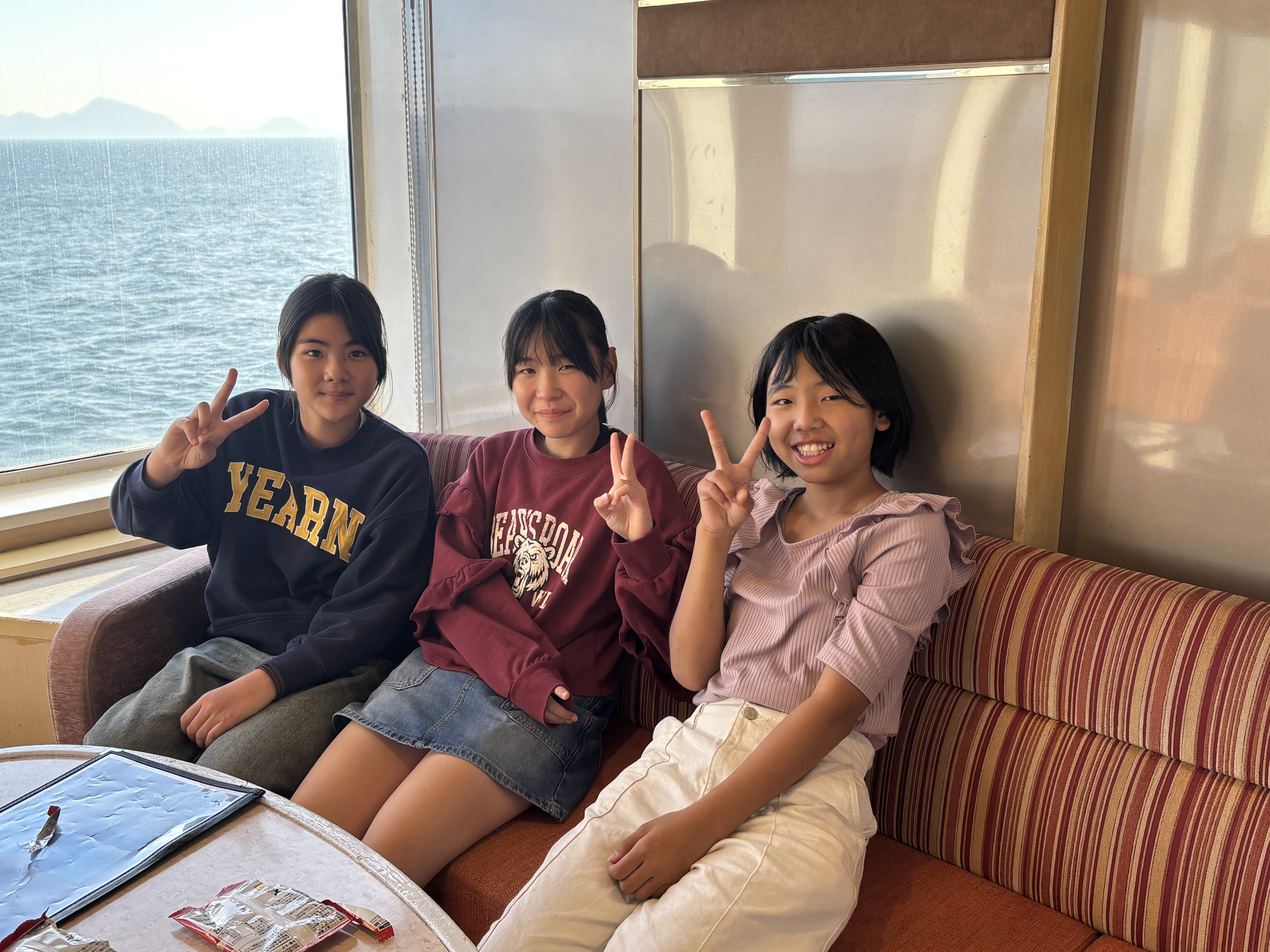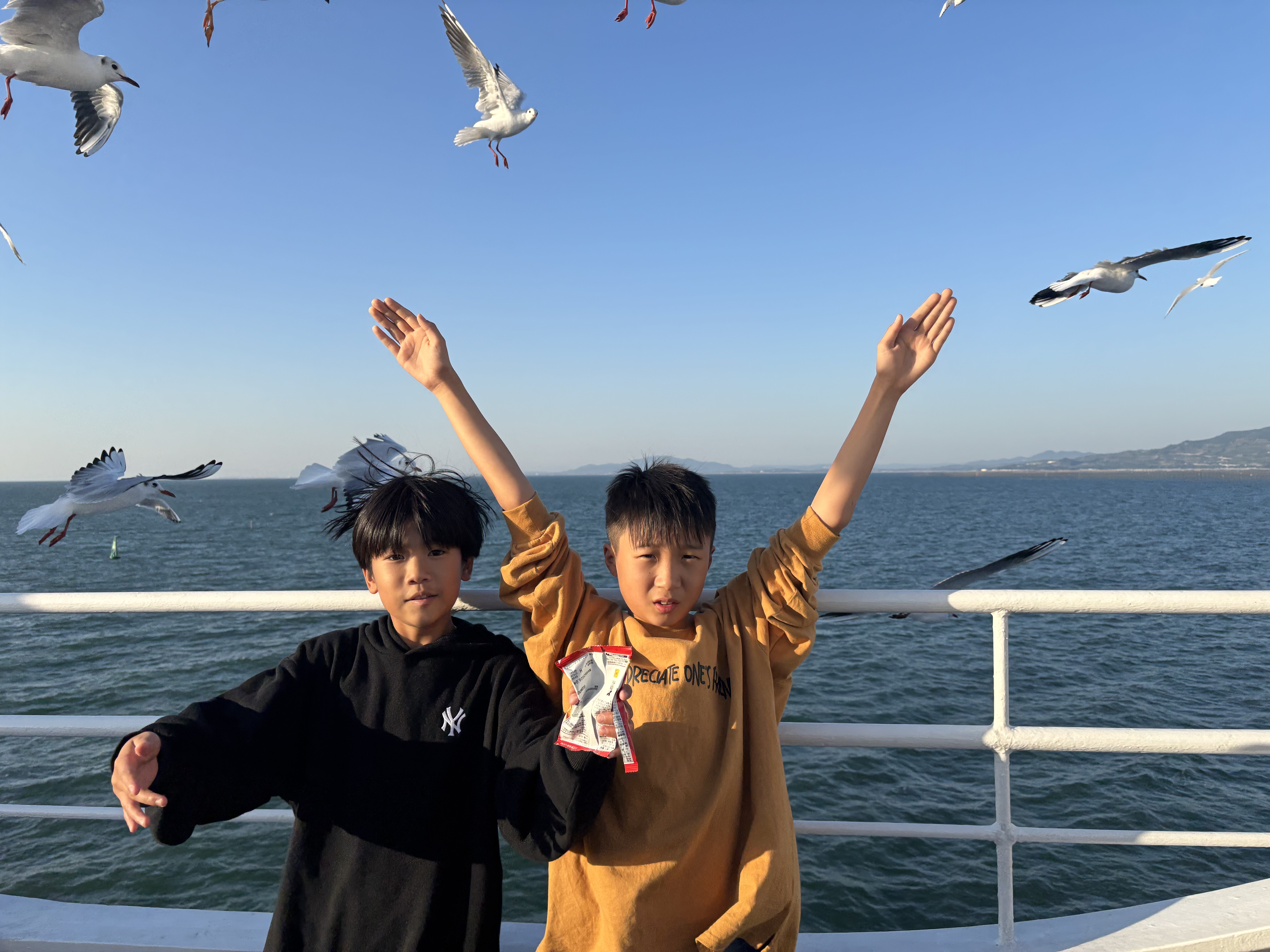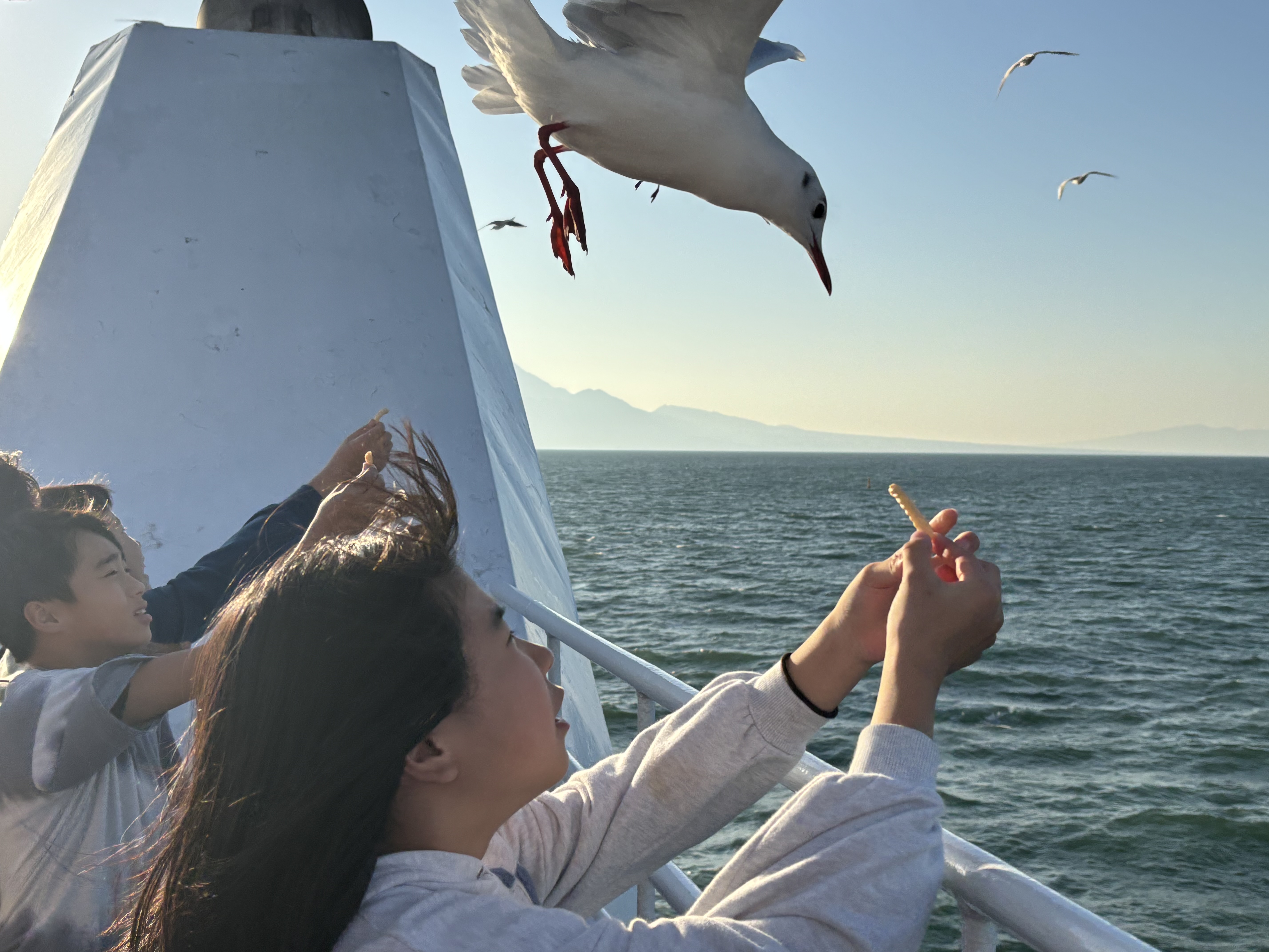 フェリー発乗船の子供達もいました。かもめへエサやり。なかなか近づいて来ないかもめたちでしたが、後からはかもめの襲来を受けるほどで、大喜び?の子供達でした。