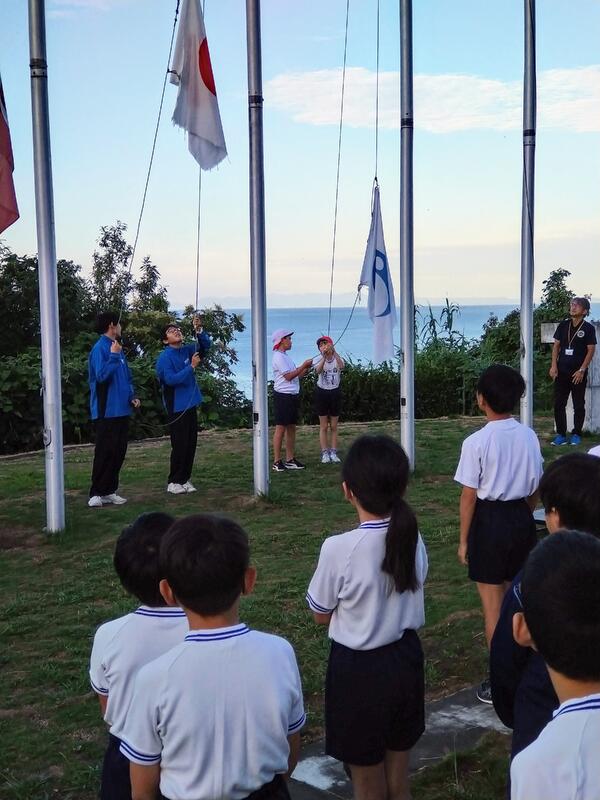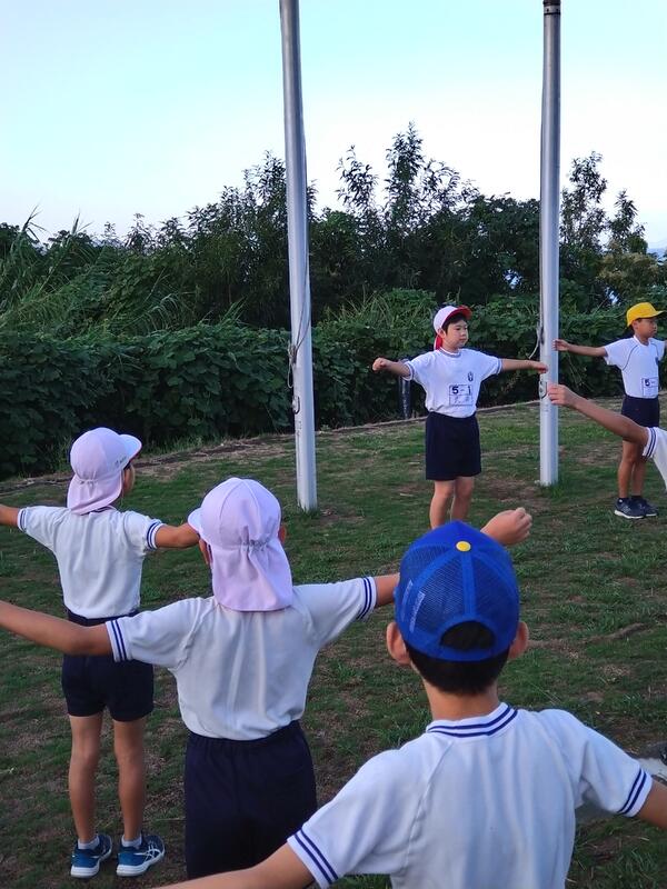 2日目のスタートは、朝のつどいです。旗揚げ係、活躍しました。ラジオ体操も頑張りました。学校紹介で他の学校と交流しました。