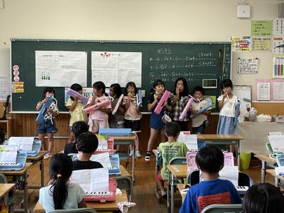 一生懸命に鍵盤ハーモニカで練習する子供たち。